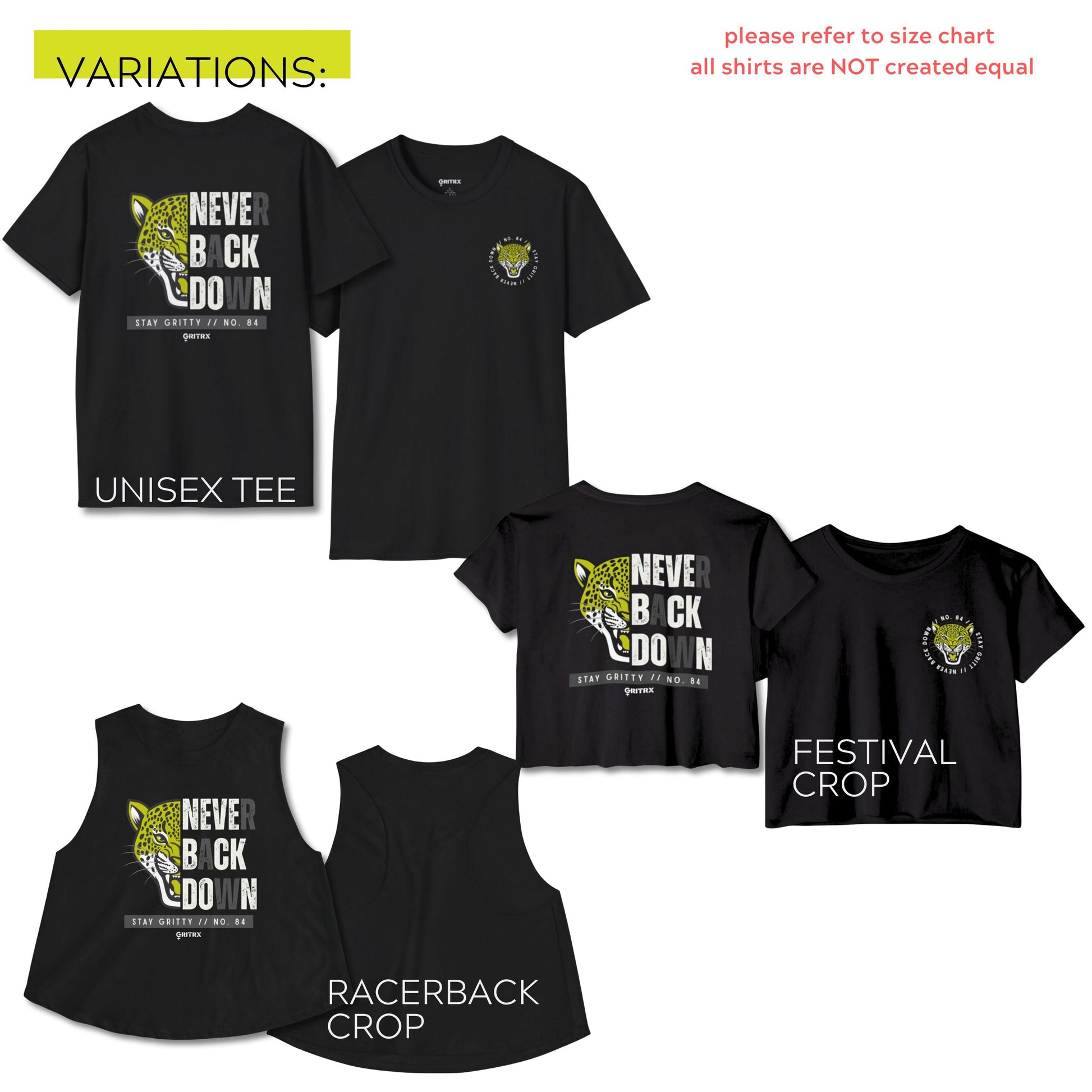 This bold tee features a ferocious leopard baring its teeth with a battle cry that says it all: Never Back Down. Paired with the GritRx signature stamp “Stay Gritty // No. 84”, this piece was made for women who lift heavy, lead loud, and live on their own terms.